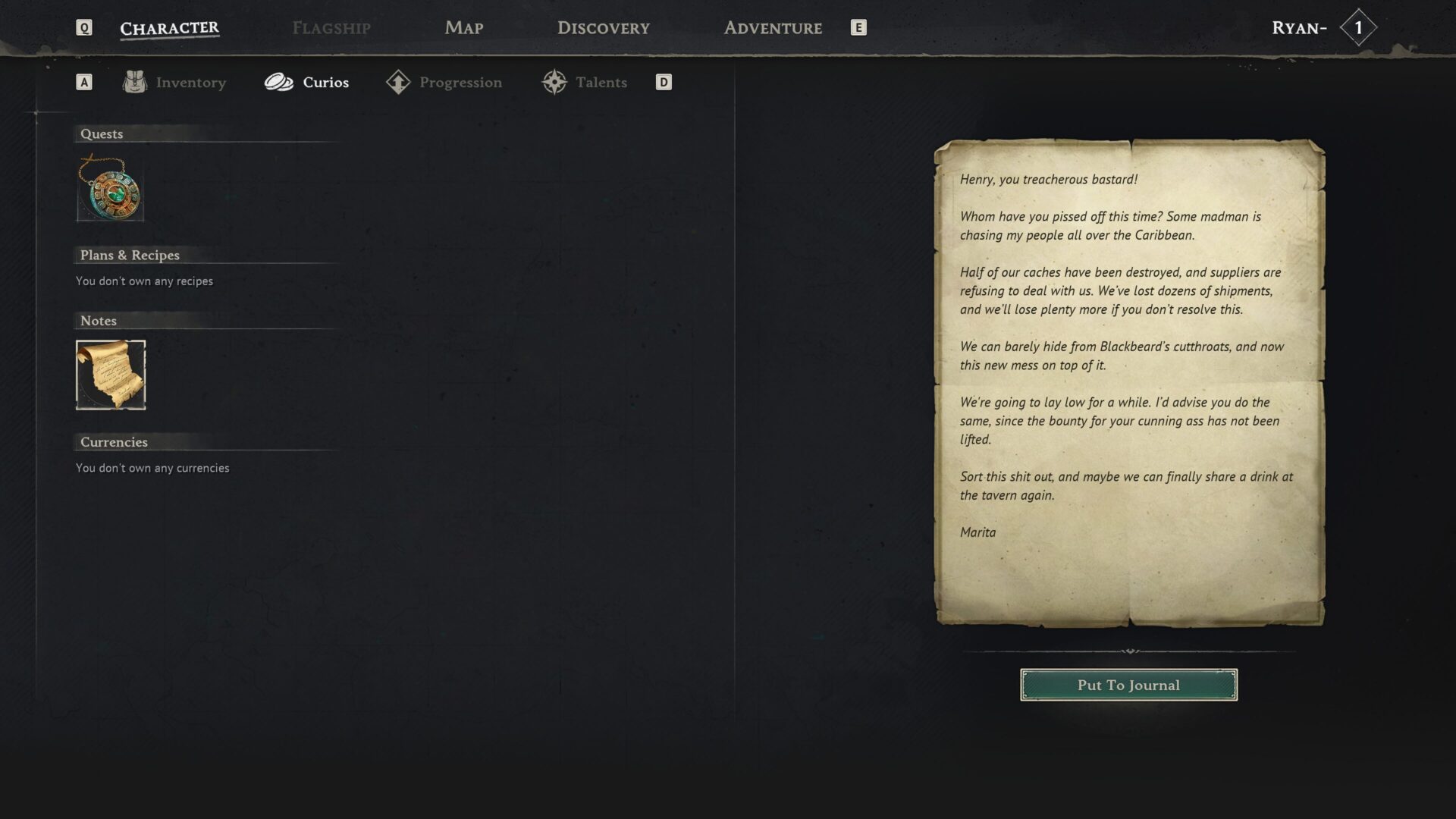 「ヘンリー、この裏切り者のろくでなし! 今度は誰を怒らせたの?どこかの狂人がカリブ海中で私の部下を追い回してるわ。 隠し場所の半分は破壊され、取引先も私たちを拒絶してる。解決しないと、もっと多くの荷を失うことになる。 私たちは黒髭の殺し屋たちから隠れるので精一杯なのに、さらにこの大混乱よ。 しばらく身を隠すわ。あなたもそうしなさい。あなたの小賢しい首にかかった懸賞金もまだ下りていないんだから。 この件を片付けなさい。そうすれば、また酒場で一緒に飲めるかもしれないわね。 ――マリタ」