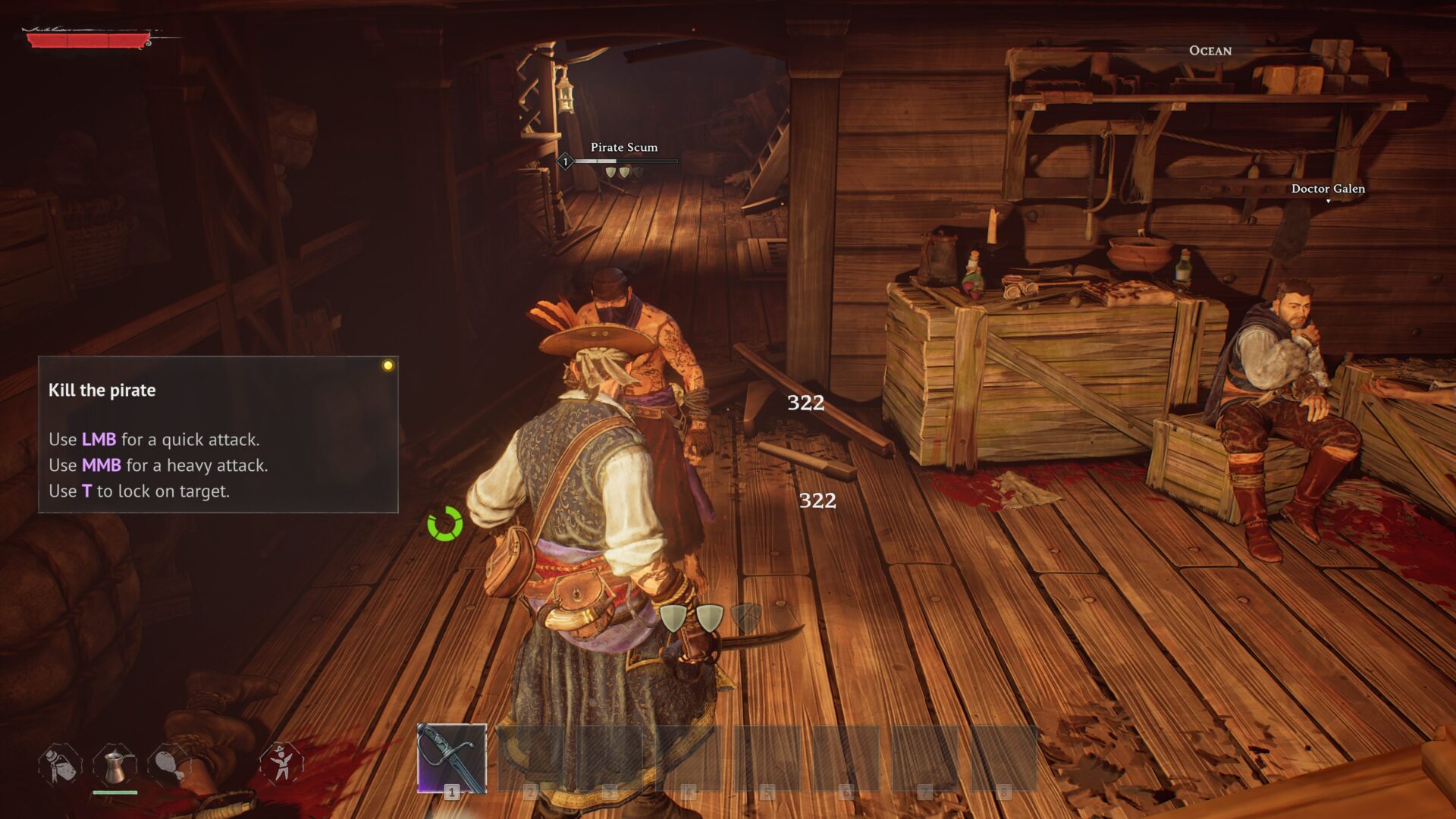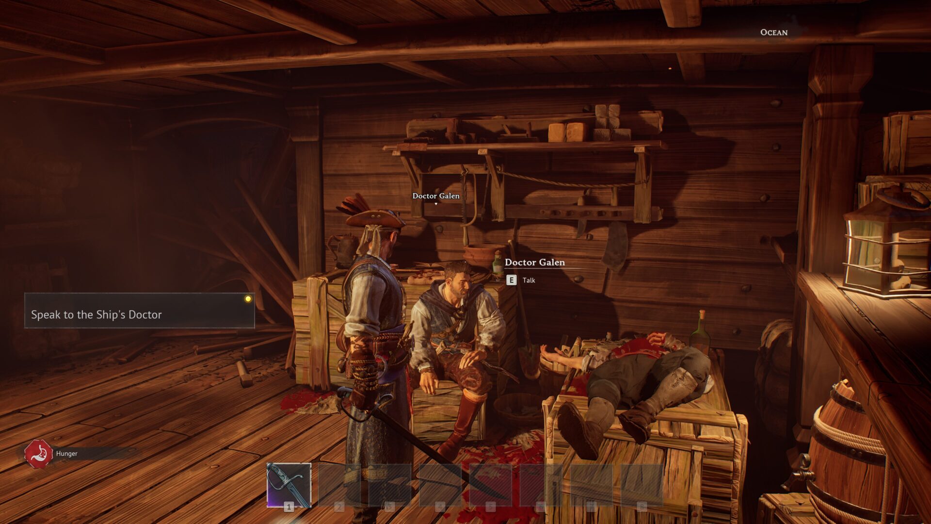 次の部屋へ進むと船内で医師のガレンと会話します。[E]で話かけます。