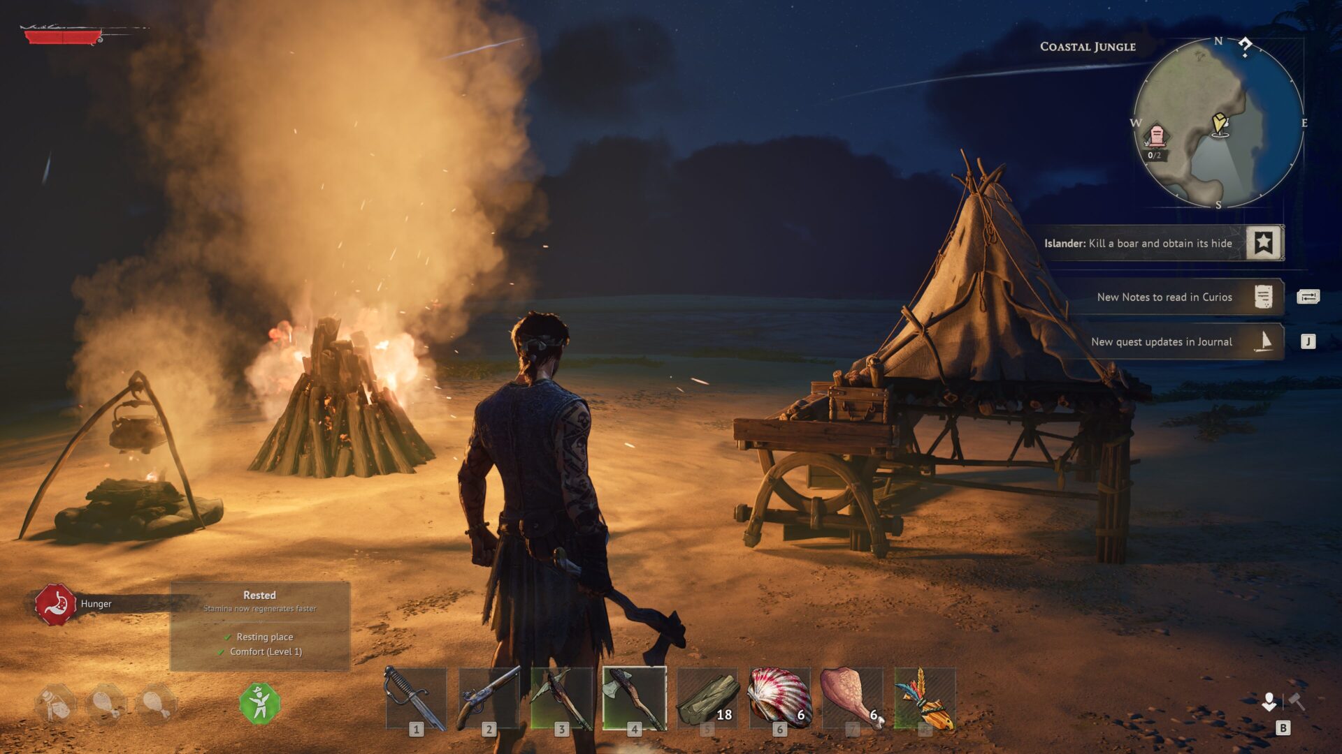キャンプエリア内にいる間、キャラクターは「Rested(休息中)」の効果を得て、スタミナの回復速度が上昇します。 この効果の強さは、キャンプの「Comfort(快適さ)」を向上させるユニークな装飾品の数によって決まります。