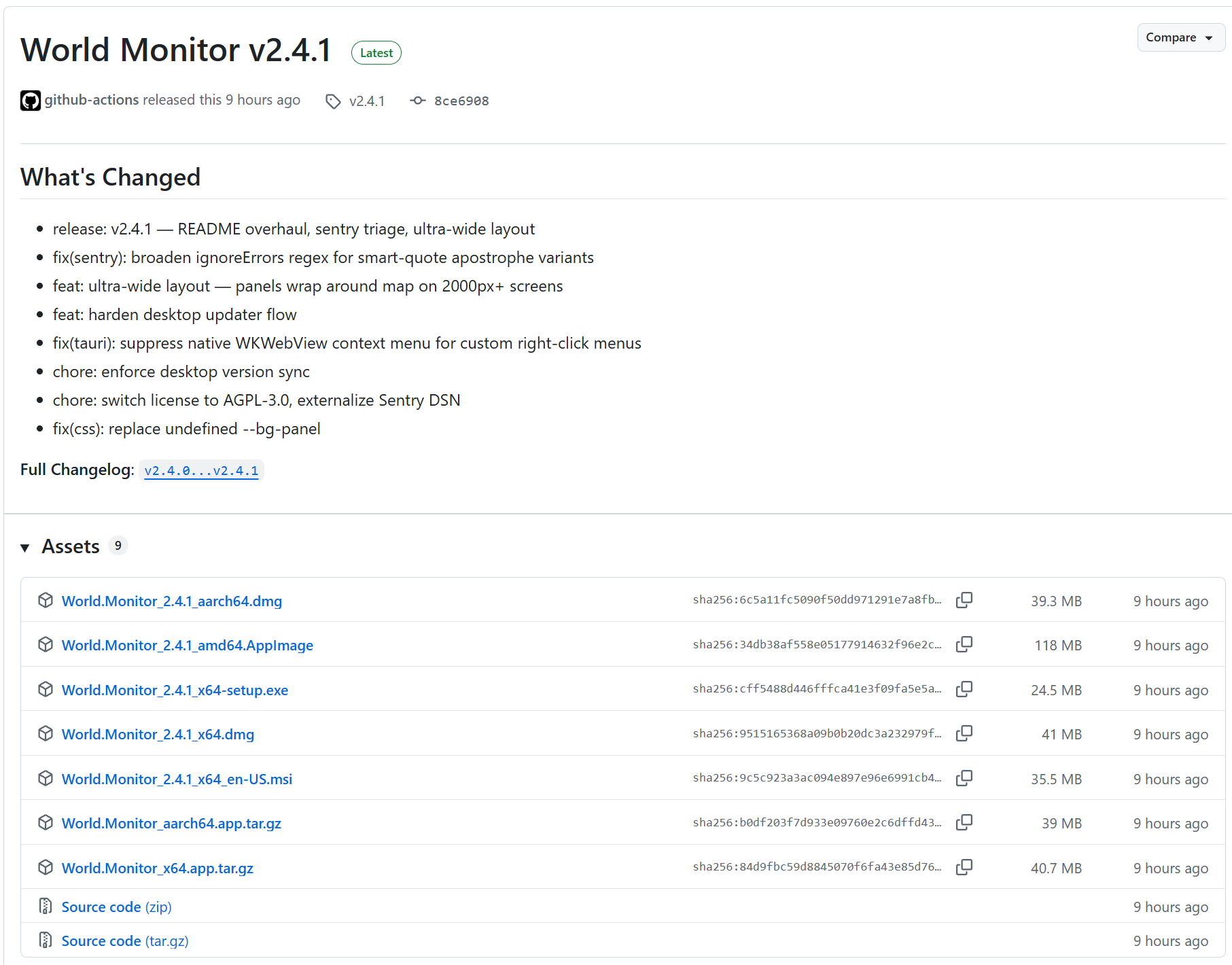 GitHubリリースページ: github.com/koala73/worldmonitor/releases/latest にアクセス