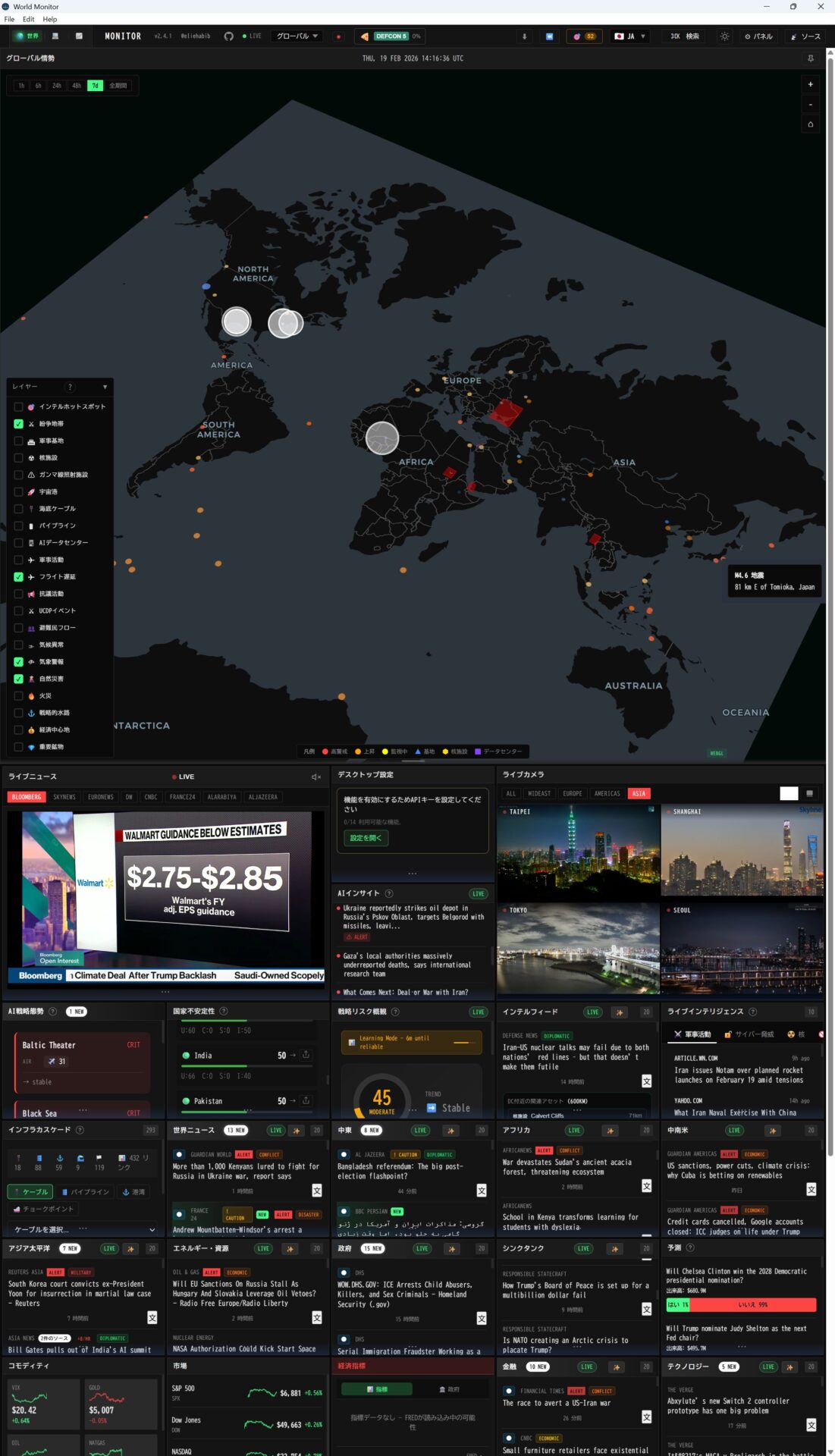 本来であれば、複数のニュースサイト、フライトレーダー、地震情報、SNSなどを別々にチェックする必要がありますが、World Monitorならそれら全てを一つの3D地球儀上で確認できます。