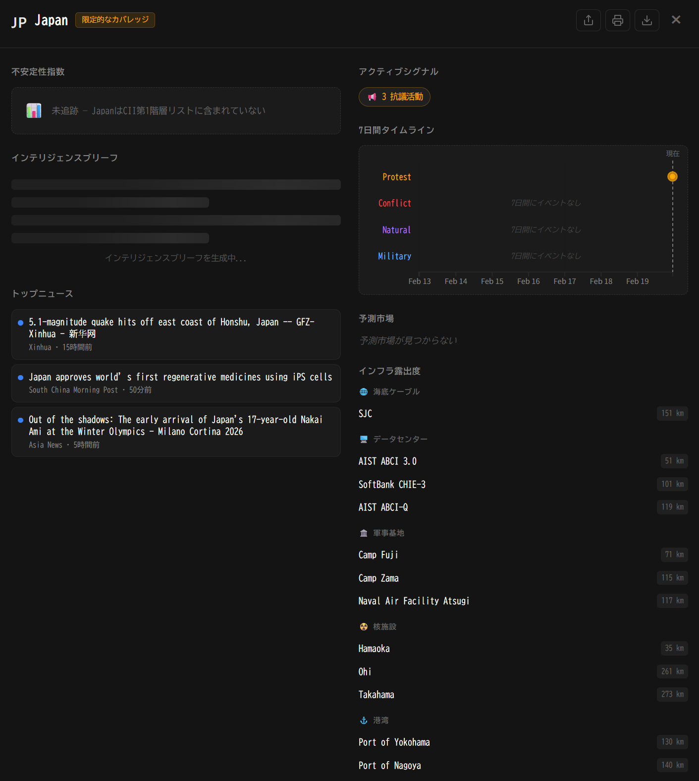地図上の任意の国をクリックしてみてください。その国専用の「インテリジェンス・ブリーフ(分析レポート)」画面が開きます。ここには以下の情報がまとまっています。