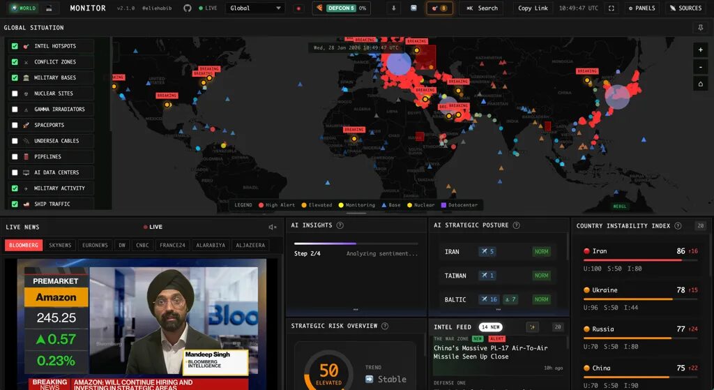 World Monitorは、世界中のニュース、地政学的な動き、災害情報、インフラ状況などを一つの画面(ダッシュボード)に集約した、完全無料のオープンソース「地球規模状況認識ツール」です。